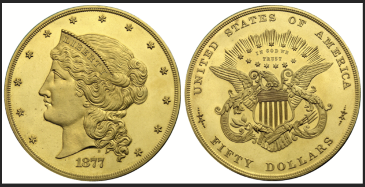 The Union and Half UnionCourtesy Peter JonesWe all know that Thomas Jefferson, Robert Morris, and Alexander Hamilton were instrumental in getting decimalized coinage adopted by the United States Congress. The denominations were mill (never minted), cents, dimes, dollars, and eagles. But did you know another denomination was also proposed... the Union, or $100. In 1877, the Philadelphia mint struck a Half Union pattern (a $50 gold piece), intended to facilitate large transactions in the West where paper money was scarce. The mint only struck pattern pieces and Congress never approved regular issue half unions. The only two solid gold patterns now reside in the Smithsonian but 14-24 copper patterns exist, some of which are gilded. William Barber designed and engraved the dies for the coin. The reverse copies the double eagle engraved by James Longacre, and the obverse looks halfway between Longacre's Liberty and Morgan's Liberty on the dollar coin. Of course, during the Californian gold rush, private companies struck $50 gold pieces called 'slugs', but these were not US Mint products.
